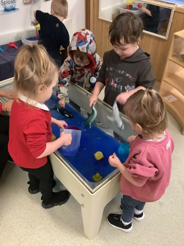 In term three our core story has been ‘shark in the park’. We have been reading the story together, using props, pictures, and water play to develop play related to this story. We love joining in and repeating the familiar words and phrases and filling in missing words ‘fancy that, it’s only a ……… (cat)’ and looking through binoculars and a real telescope!