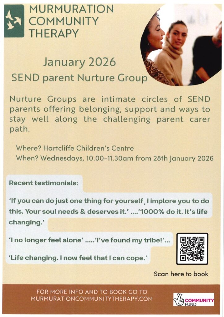 Murmuration Community Therapy is running a SEND Parent Nurture Group at Hartcliffe Children’s Centre starting in January 2026, offering vital support for parents and carers of children with special educational needs and disabilities.