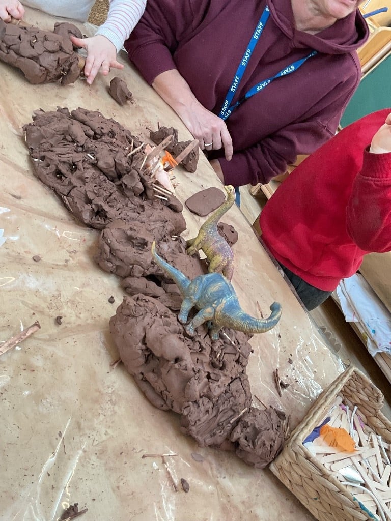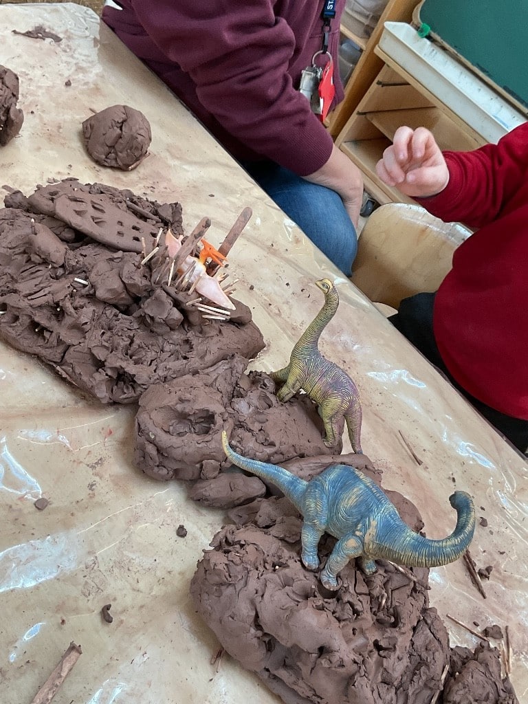 Adults follow the children’s lead and allow them to explore and follow their own ideas and imagination. Some children want to make models like dinosaurs or frogs so they are learning to create different shapes like rolling balls and snakes to represent different features, while others want to experiment with adding other materials like water and sticks and noticing the changes and effects that occur as they use their hands to shape the clay.